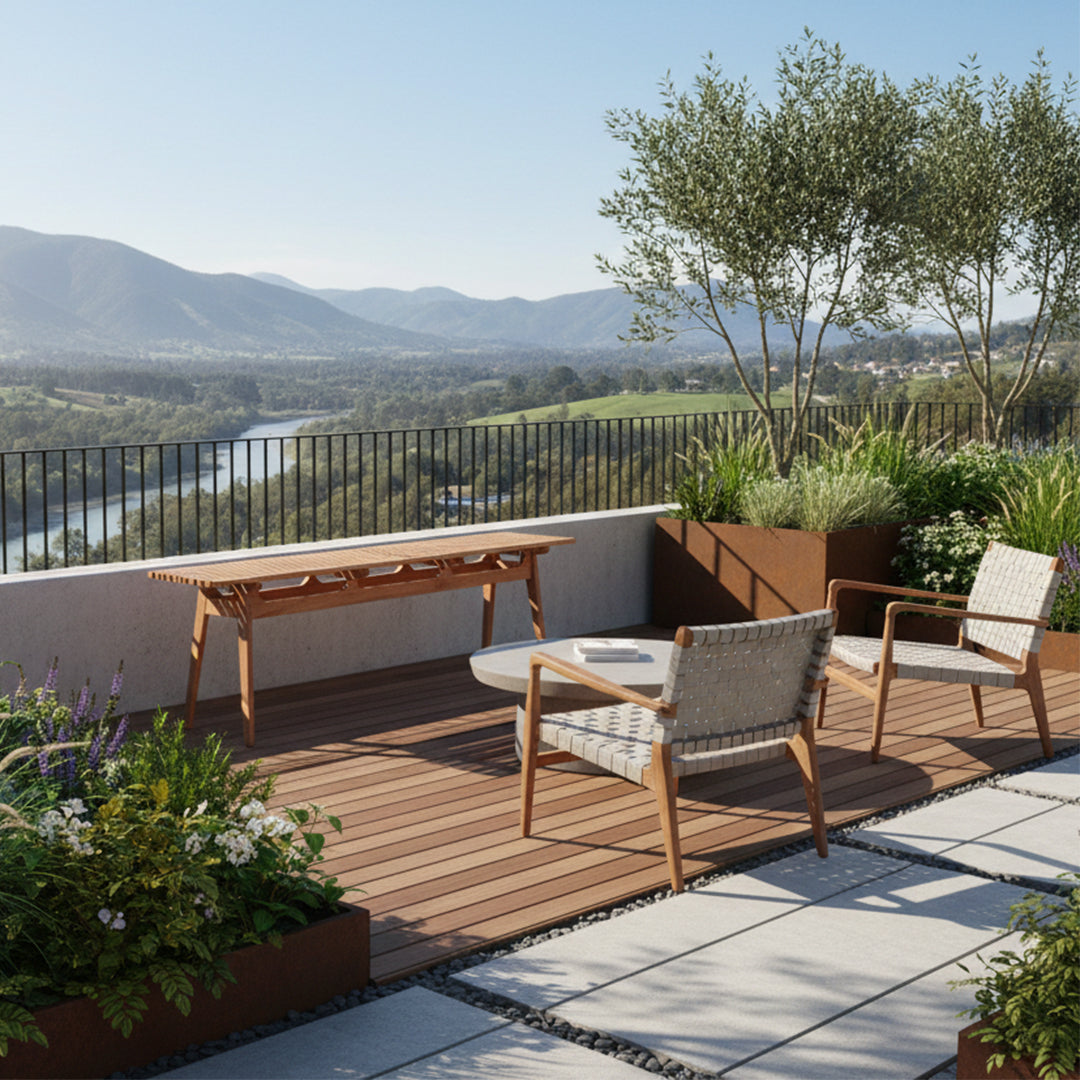 Colección de muebles de jardín de madera de garapeira. Aquí es donde descansarás tu mente y espíritu. La colección Ayty está compuesta por piezas que traducen el verdadero significado de estar en contacto con la naturaleza. El acabado, naturalmente rústico, cambia sobre la madera expuesta a la intemperie, según la región, dejando que la naturaleza deje sus marcas. La colección Ayty está formada por piezas de grandes dimensiones para jardines, piscinas y terrazas, que destacan por el confort y la relajación total del cuerpo. Ha sido concebida para que las pocas horas de ocio que tenemos se transformen en incansables momentos de placer, extendiéndose fuera de casa. La madera representa la fuerza de la naturaleza, fuerte contra el tiempo y rústica en su acabado. Las telas ligeras y los cojines sueltos son la naturaleza acogedora que se amolda al cuerpo.