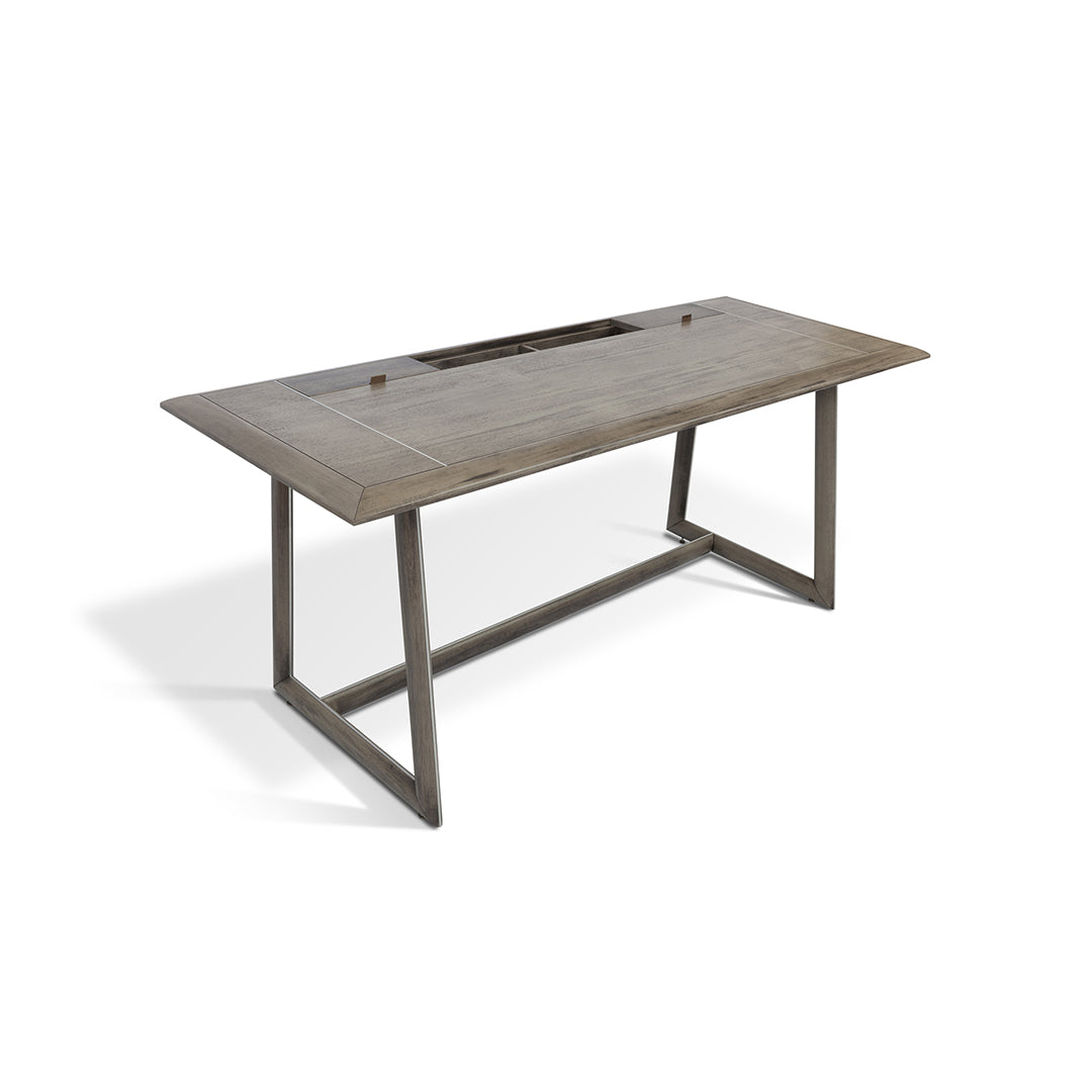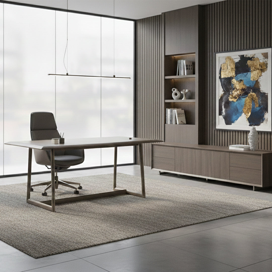 El escritorio Lavoro tiene su personalidad grabada en metal. Una cinta delgada se ajusta sobre la parte superior y el marco de madera dura. Es la fuerza de trabajo representada en la (sutil) presencia del metal. Los bordes superiores mecanizados aseguran la comodidad de los reposabrazos. Pequeños nichos permiten organizar algunos objetos, con toma de corriente y USB. Se dispone de algunos accesorios para facilitar su uso: alfombra de piel natural para la zona de escritura de una mesa de trabajo.