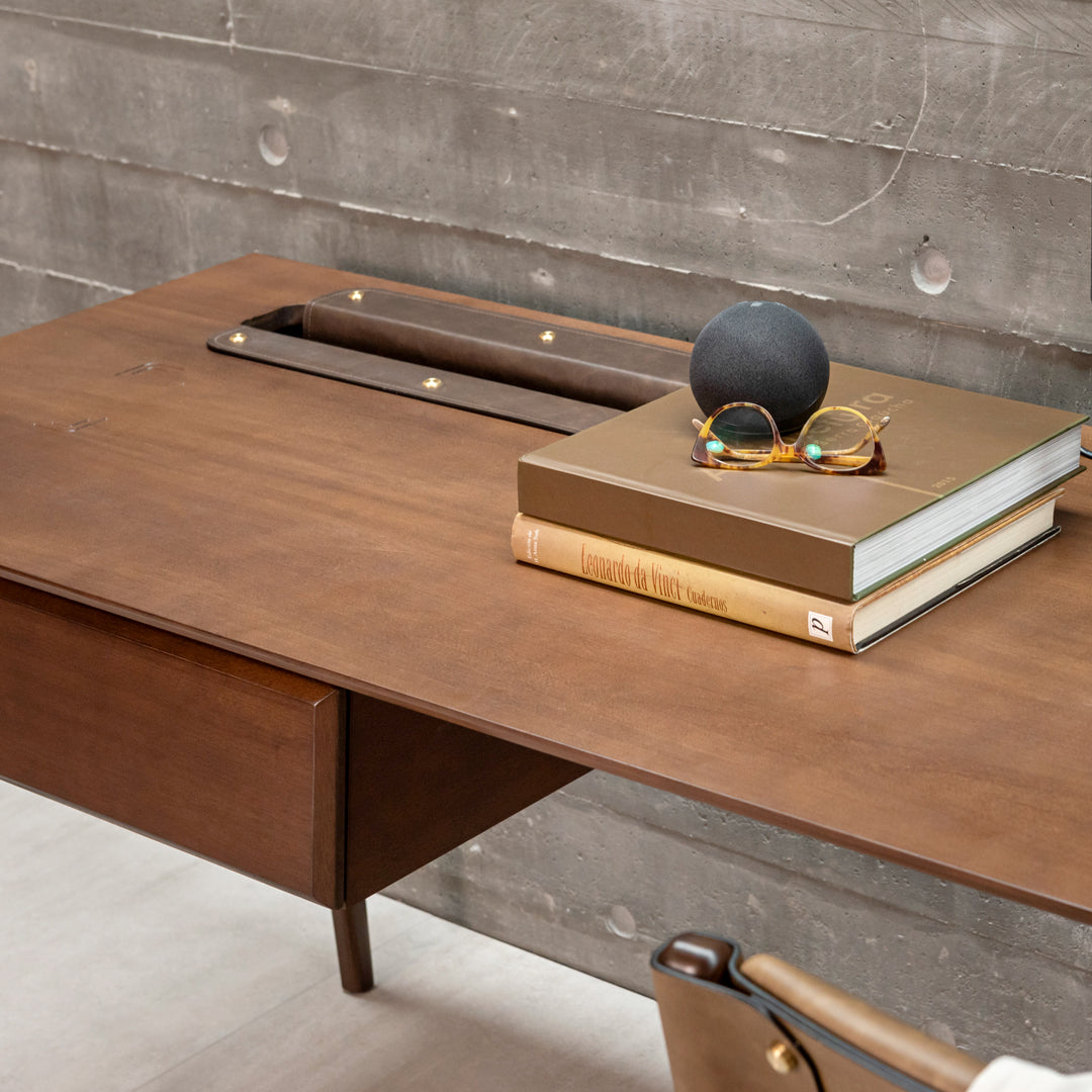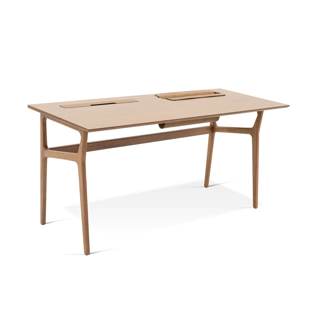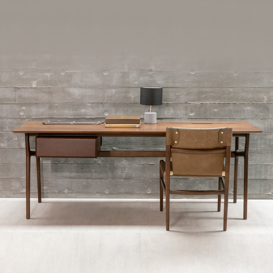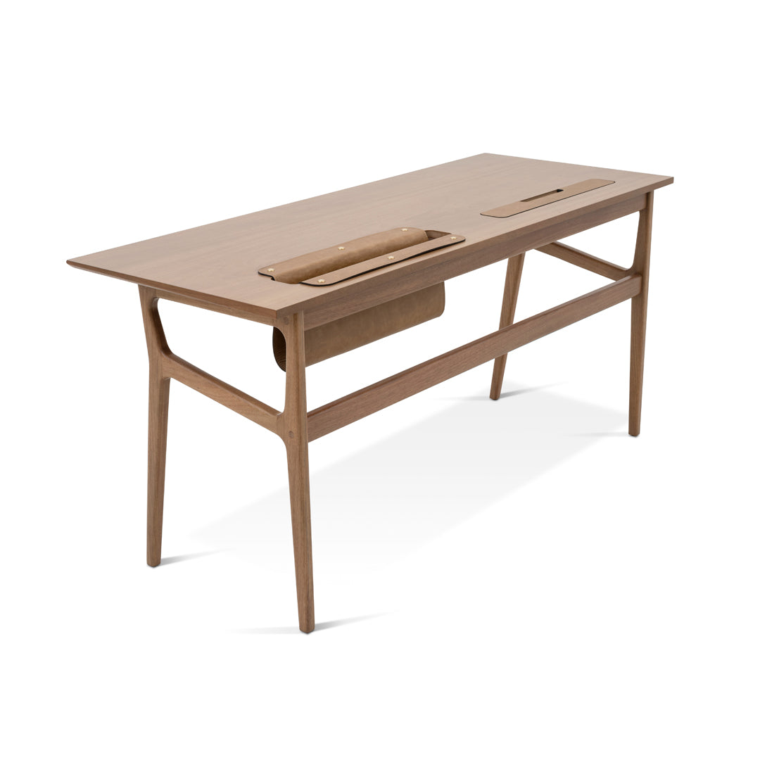 El escritorio Tab fue diseñado con el propósito de ser una pieza funcional, fundamentándose a través de un diseño directo para proporcionar la comodidad necesaria en diversos entornos, ya sea profesional o personal. Extendiéndose desde el tope, añade un encantador portarevistas de cuero suspendido. En la esquina opuesta, hay una abertura para el paso de cables. También cuenta con un cargador inalámbrico para teléfonos móviles. Forma y función dedicadas en una pieza armónica, enfatizando el diseño en su totalidad.