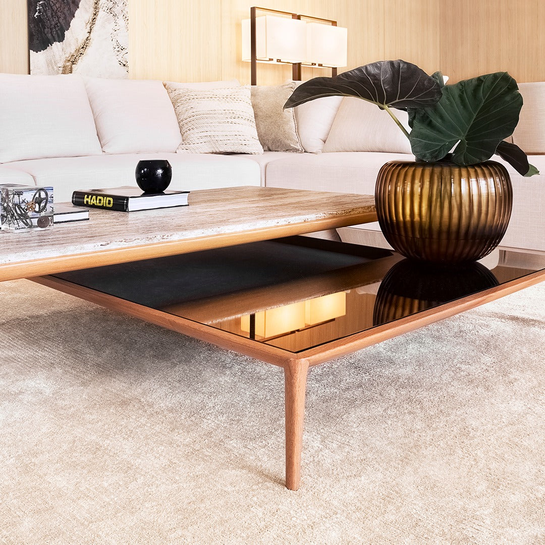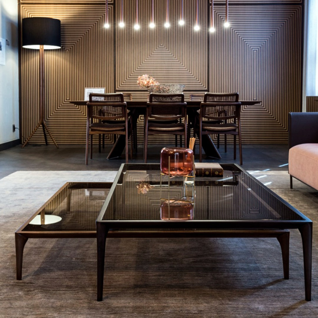Diseñada para crear un ambiente auténtico y moderno, la línea de mesas Mogano incluye mesas auxiliares y mesas de café que se pueden utilizar en la composición, complementando el ambiente. La base escultórica tiene dinamismo en las líneas y formas ligeramente redondeadas, además, las tapas con opciones de vidrio, espejo y Aluslim, donde se hace evidente la exuberancia de la piedra, le traducen un toque de modernidad a la pieza.