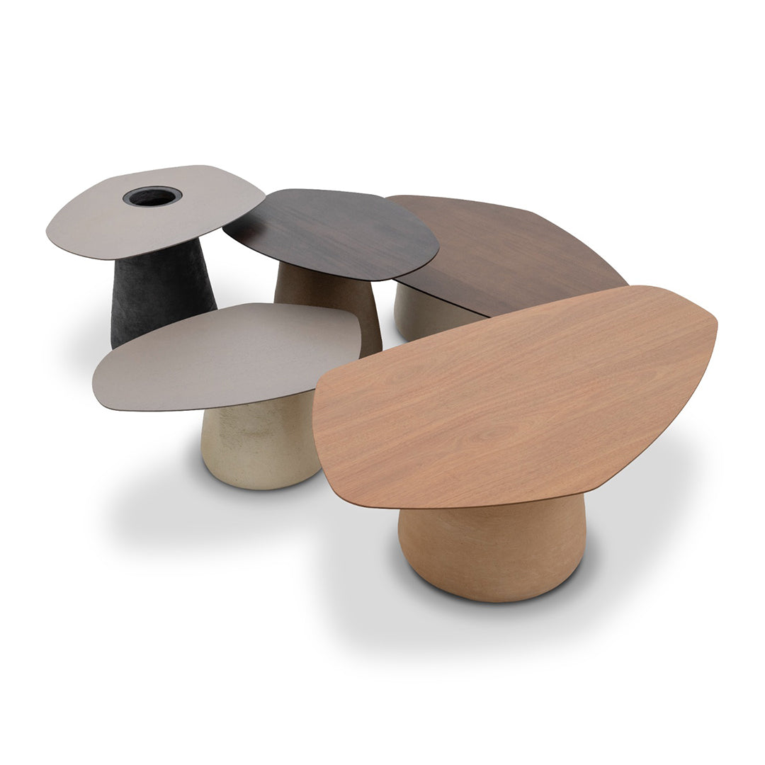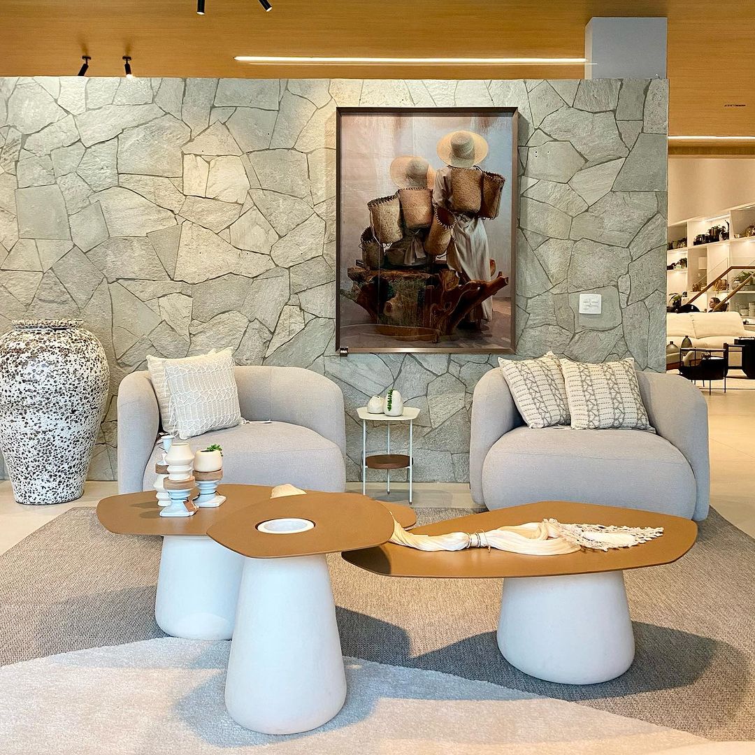 Desde tiempos prehistóricos, los tótems de piedra se han utilizado como herramientas para diversos fines. Se utilizaban para demarcar senderos y caminos, tenían funciones ceremoniales (como Stonehenge en Inglaterra) o como herramienta de caza y defensa. El proceso de construcción de estas “esculturas” también se conoce como equilibrio de rocas y se utiliza como herramienta de meditación. Un ejercicio sobre la impermanencia del todo y vinculado a las elecciones que conducen al equilibrio. La línea Seixo propone la conexión entre exterior e interior a través de las formas que remiten a las piedras desgastadas por la acción del agua en los ríos y las bases cerámicas que aportan rusticidad sin renunciar a la elegancia. Las mesas de la línea funcionan como guijarros, que al combinarse crean diferentes formas y adquieren nuevos significados.