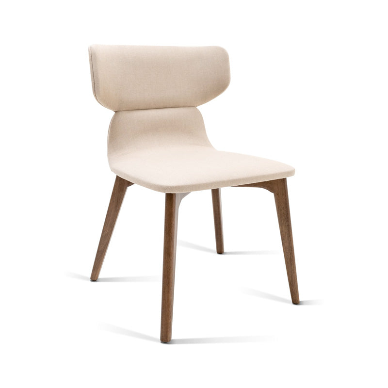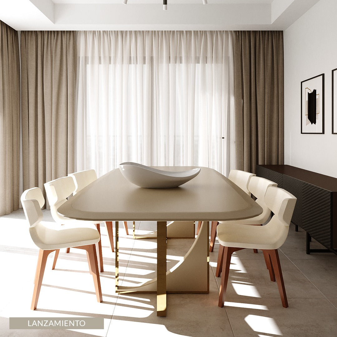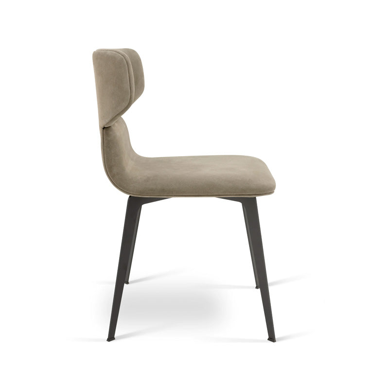 Aspen, una elegante silla con estructura de metal y casco tapizado en cuero, ante o tela. La forma suave y acogedora del respaldo contrasta con la rigidez y las líneas bien definidas que diseñan la base de la silla, creando un producto atemporal y de marcada personalidad.