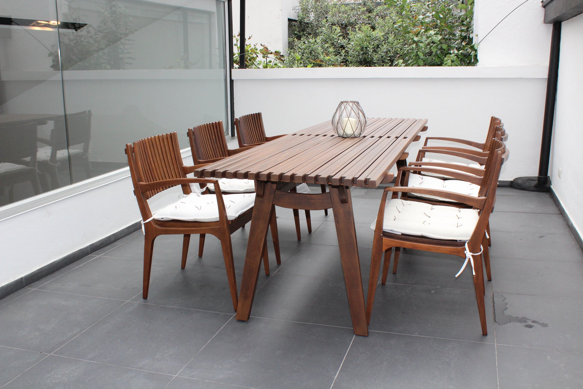 Colección de muebles de jardín de madera de garapeira. Aquí es donde descansarás tu mente y espíritu. La colección Ayty está compuesta por piezas que traducen el verdadero significado de estar en contacto con la naturaleza. El acabado, naturalmente rústico, cambia sobre la madera expuesta a la intemperie, según la región, dejando que la naturaleza deje sus marcas. La colección Ayty está formada por piezas de grandes dimensiones para jardines, piscinas y terrazas, que destacan por el confort y la relajación total del cuerpo. Ha sido concebida para que las pocas horas de ocio que tenemos se transformen en incansables momentos de placer, extendiéndose fuera de casa. La madera representa la fuerza de la naturaleza, fuerte contra el tiempo y rústica en su acabado. Las telas ligeras y los cojines sueltos son la naturaleza acogedora que se amolda al cuerpo.